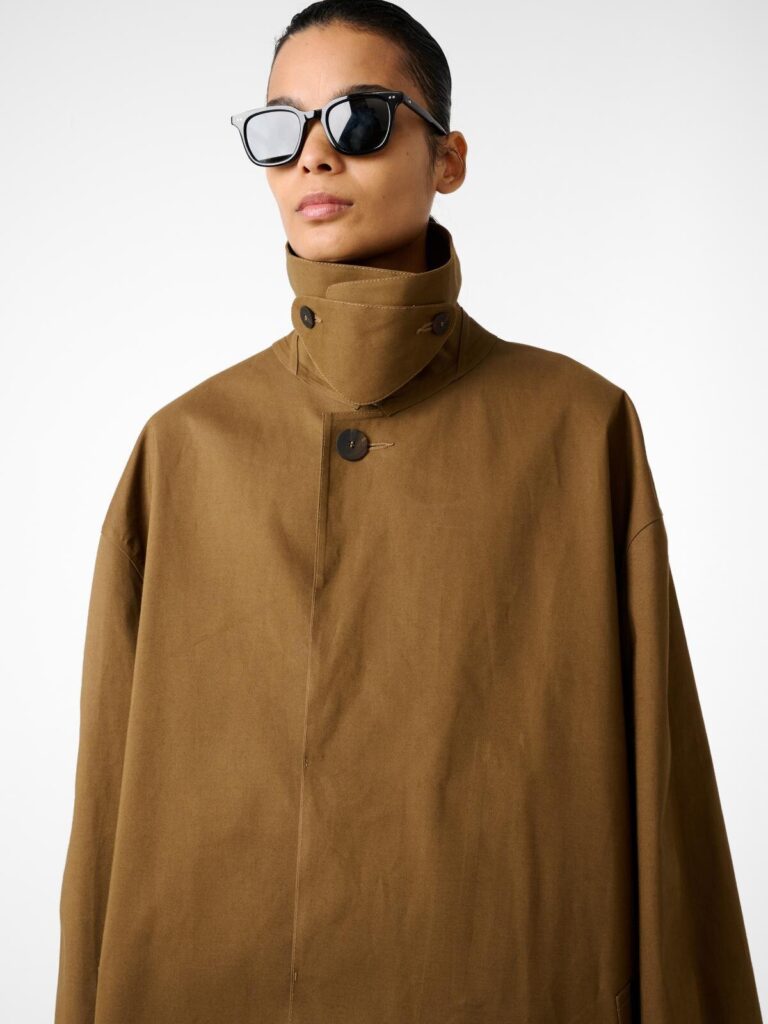 注目のコート「エトリック」は、クラシカルな膝丈シルエットで、ゆったりとしたオーバーサイズフィットが特徴。襟を立てるとモード感が一層引き立ち、シーンに応じたスタイリングが楽しめる。カラーはブラック・ブラウン・ネイビーの3色展開で、落ち着いたトーンながら存在感のある仕上がりとなっている。