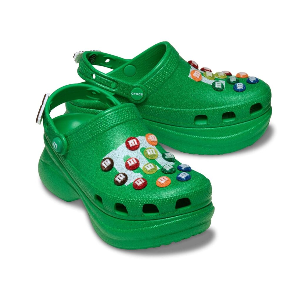 厚底仕様の「ベイ クロッグ」には、大胆に“M”ロゴをプリント。赤・黄・青・緑といった鮮やかなカラーを使った「M&M’S」そっくりのジビッツチャームが26個セットになっており、遊び心満点のデザインに仕上がっている。シューズ本体だけでなくチャームにもグリッター加工が施されており、足元を華やかに輝かせてくれるのもポイント。ファッションのアクセントとしても存在感を放ち、履くだけで気分が明るくなりそうだ。