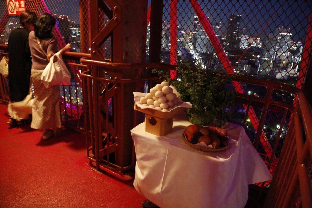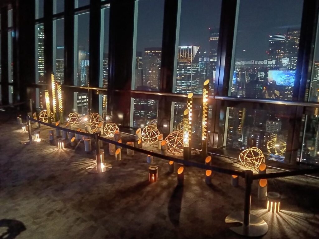 普段、外階段の開放は土日祝日の昼間に限られているが、当日は特別に夜間21:00まで利用可能。メインデッキ1階クラブ333付近では、ススキや団子を飾り、まるで昔ながらのお月見を再現したような演出が施され、夜空に浮かぶ月と一体となった風情を味わえる。