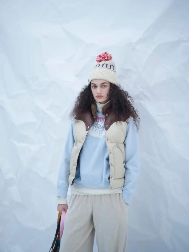さらに、日本発のブランド・バウワウ(BOW WOW)との取り組みでは、人気の“雪柄スウェット”をアレンジ。クルーネックタイプとハーフジップタイプの2型を製作し、冬らしい明るい雪柄を配した。全体にはヴィンテージさながらの着古し加工を施し、まるで長年愛用してきたかのような独特の風合いを演出している。