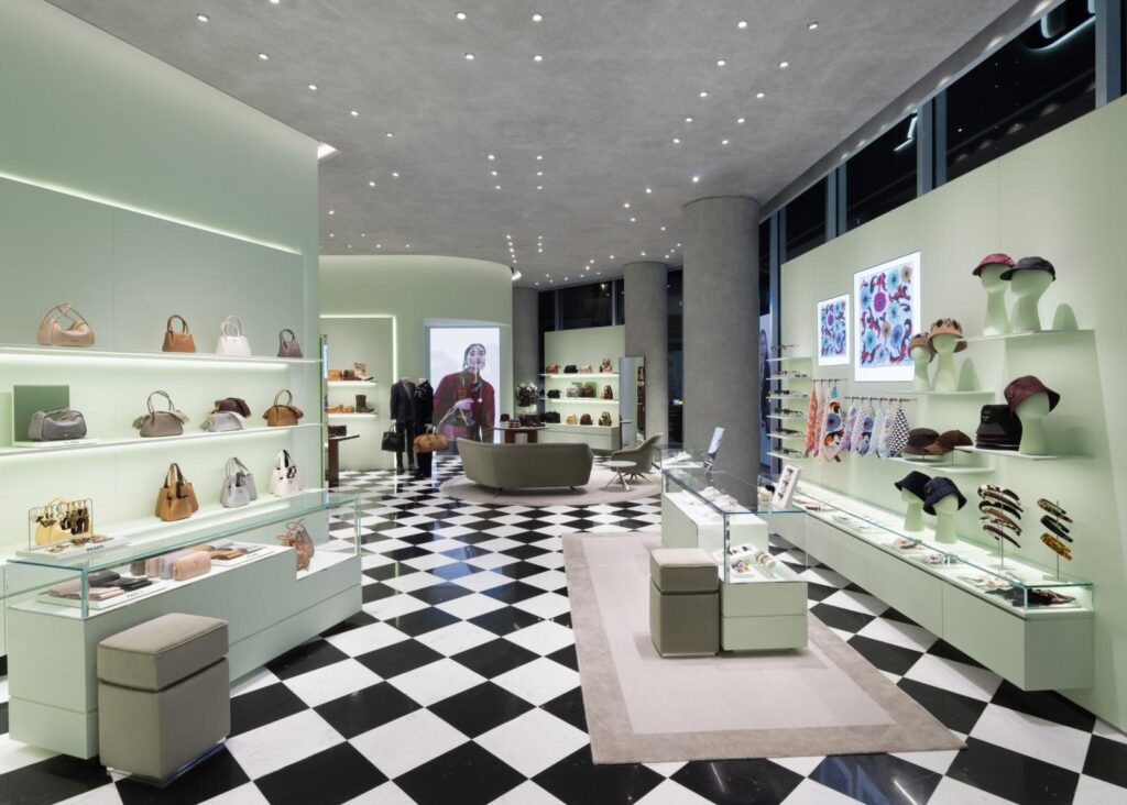 ■洗練された2つの新店舗 東急プラザ銀座店は2フロア構成で、ウィメンズ&メンズのウェア、レザーグッズ、シューズ、アクセサリーをフルラインナップ。開放的なガラスファサードからは店内を一望でき、ミラノのプラダ1号店から着想を得た大理石の市松模様フロアが特徴だ。ギンザシックス店は吹き抜けを活かした広々とした空間で、同じく多彩なアイテムを取り揃える。こちらの市松模様はカーペットで表現され、上品な雰囲気を演出する。