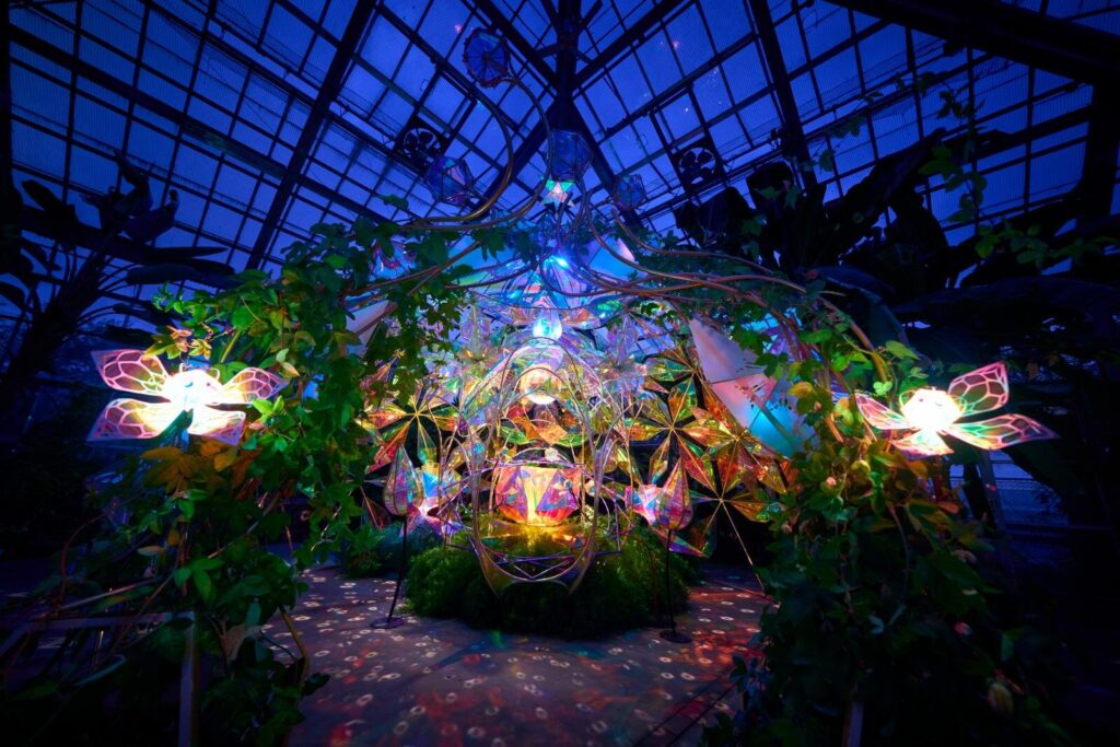 ■光とバラのインスタレーション ガラス張りの大温室には、直径6mのドームと高さ2.4mの卵型オブジェを組み合わせた「光とバラのインスタレーション」が登場。照明演出によりバラのモチーフが浮かび上がり、訪れる人々を幻想的な空間へと誘う。また、温室内には3人乗りのメリーゴーラウンド「ブリリアント ツリー」が設置され、シャボン玉が舞い出す仕掛けとともに子どもから大人まで楽しめる。
