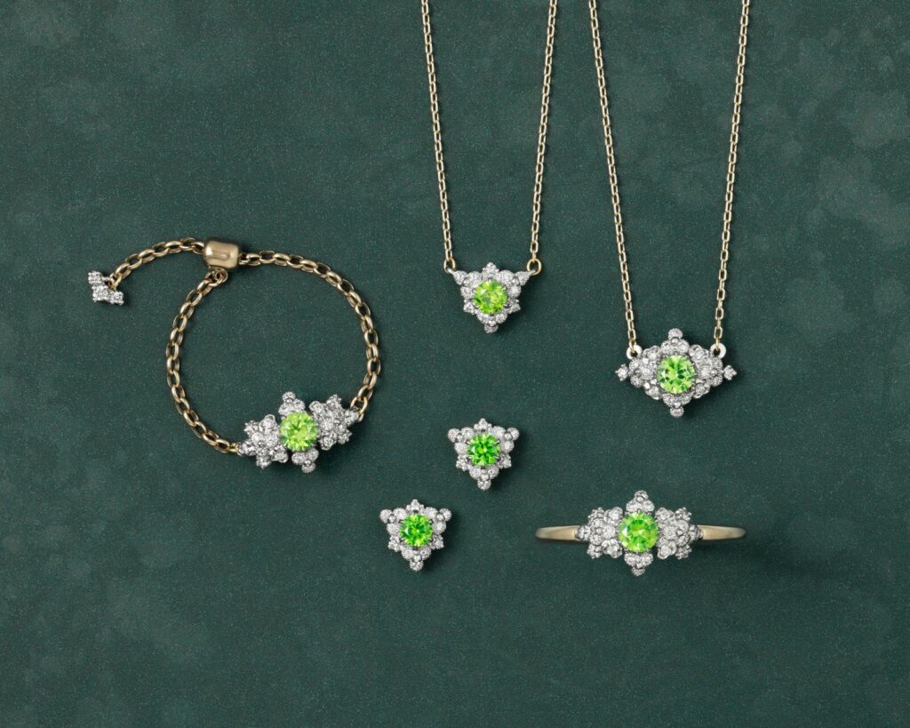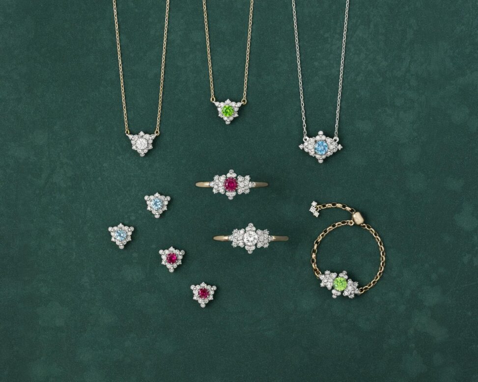 ■彩り豊かなセンターストーン コレクションの主役となるのは、4種類のセンターストーン。清らかな輝きを放つダイヤモンド、深紅のルビー、澄んだ水色が美しいアクアマリン、そして鮮やかなグリーンのデマントイドガーネット。それぞれが異なる表情を持ち、冬の装いに華やかさをプラスしてくれる。