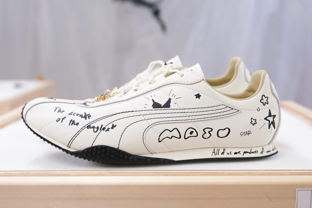 中でも注目を集めるのは、ランニングスパイク「H-ストリート」をベースにしたスニーカー「H-ストリート “ボーイズ ノート”」。純白のスムースレザーをキャンバスに見立て、“天使”や“星”、“弓矢”などM A S Uの象徴的なイラストを手書き風にプリントした。プーマのサイドラインはブラックのステッチで強調され、まるで落書きがそのまま刻まれたようなアートピースのような仕上がり。さらに、シューレース部分には“金メダル”を連想させるゴールドチャームが輝き、さりげないアクセントを加えている。