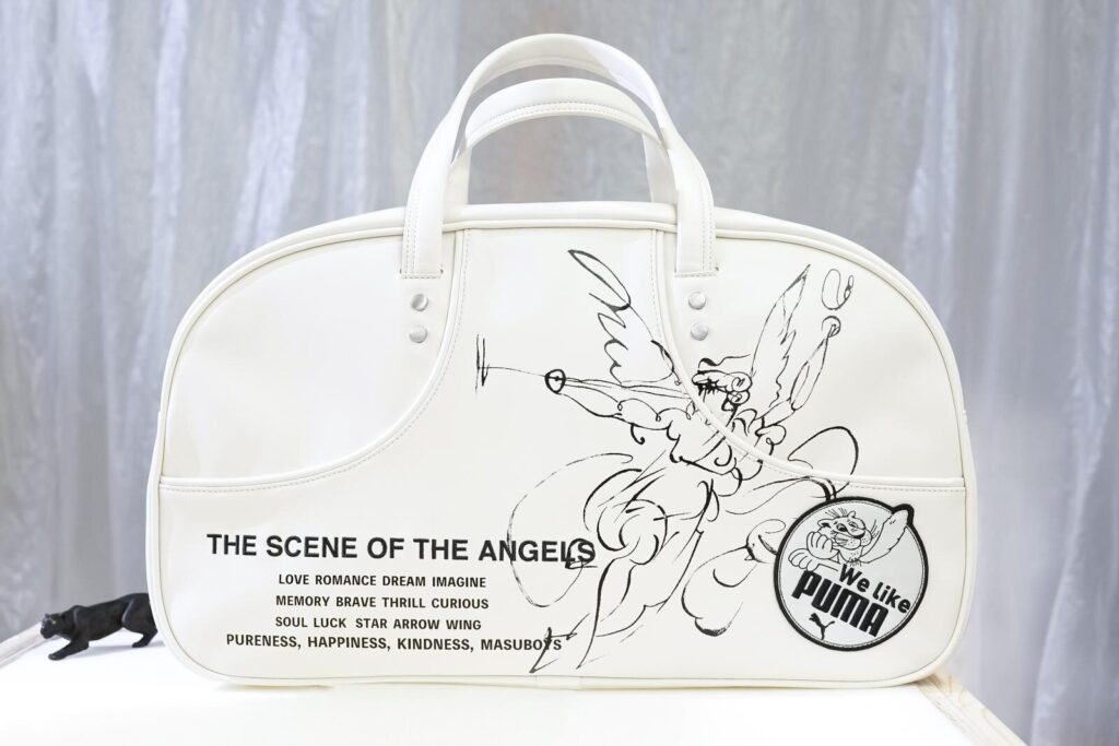 また、大容量の「グリップバッグ “ボーイズ ノート”」もラインナップ。1976年にプーマから登場したグリップバッグをベースに、レトロな佇まいを継承しつつM A S U流のアレンジを加えている。右下のエンブレムは立体的なワッペンで再現し、左下にはM A S Uの“合言葉”をプリント。さらに、手書き風の“天使”イラストを加えることで、コラボレーションならではの遊び心を表現している。しっかりとしたマチがあり、旅行やスポーツ、デイリーユースまで幅広く活躍できるのも魅力だ。