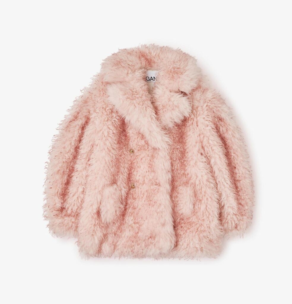 アウターでは、ダブルブレスト仕様のフェイクファーコートが目を引く。毛足の長いふんわりとした素材感がラグジュアリーな存在感を放ち、冬のスタイリングを主役級に格上げしてくれる一着となっている。