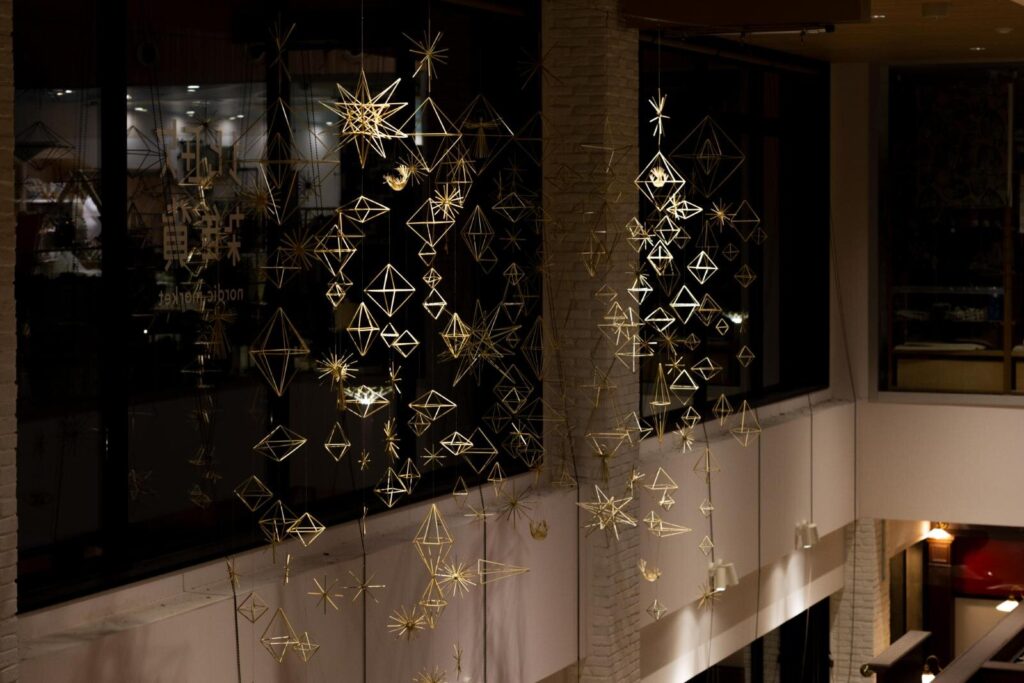 中でも見逃せないのが、フィンランドの伝統工芸「ヒンメリ」をモチーフにしたイルミネーション「天空のヒンメリロード」。大小100個の立体オーナメントが並木道を彩り、光に照らされて幻想的な輝きを放つ。3回目となる今回は規模を拡大し、より広いエリアで楽しめるようになっている。マーケットホールの室内には、リトアニアの装飾工芸「ソダス」が展示され、幾何学的な多面体や雪のモチーフが空気に揺らめく姿が冬の情景を想起させる。