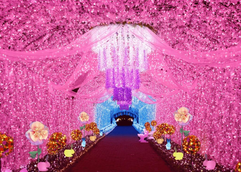 さらに圧巻なのが、全長約300mに及ぶ「光のトンネル」。歩みを進めるごとに、カラフルな“はじまりの森”、ピンクがきらめく“ファンタジーロード”、星降る夜を思わせる“スターライトロード”、そして神秘的な“魅惑の洞窟”と、異なる世界が次々と現れる。洞窟を抜けると目の前に広がるのは「魔法の教会」。ここではプロジェクションマッピングを用いた“女王の願いが輝く物語”が上映され、光に包まれるような体験を楽しむことができる。