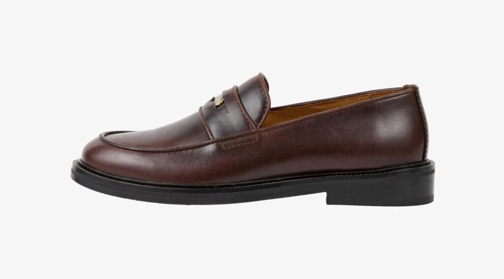 シューズからは、しなやかなスムースレザーのペニーローファーが登場。深みのあるダークマロンカラーに、ベージュのステッチがアクセントとして映える。サドル部分の切れ込みには、A.P.C.のデザイナー ジャン・トゥイトゥ(Jean Touitou)とマーク ジェイコブスを象徴するモチーフコインを忍ばせた遊び心あふれるデザインとなっている。