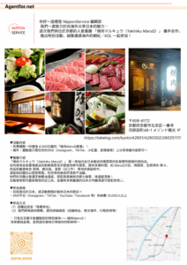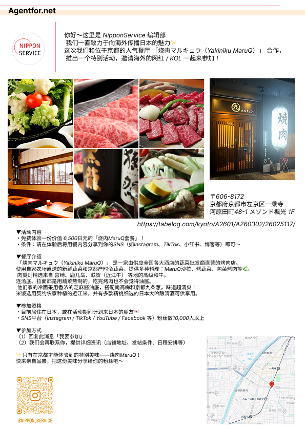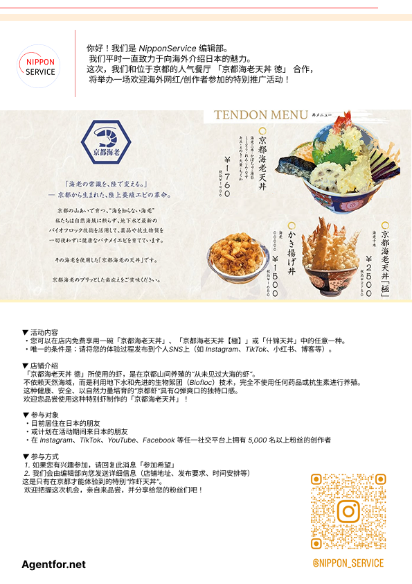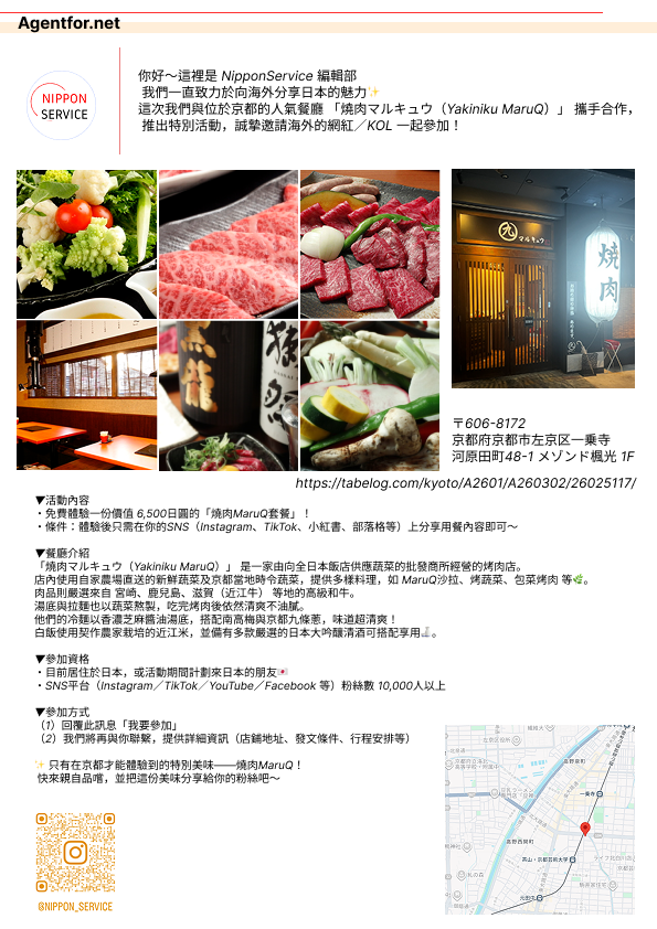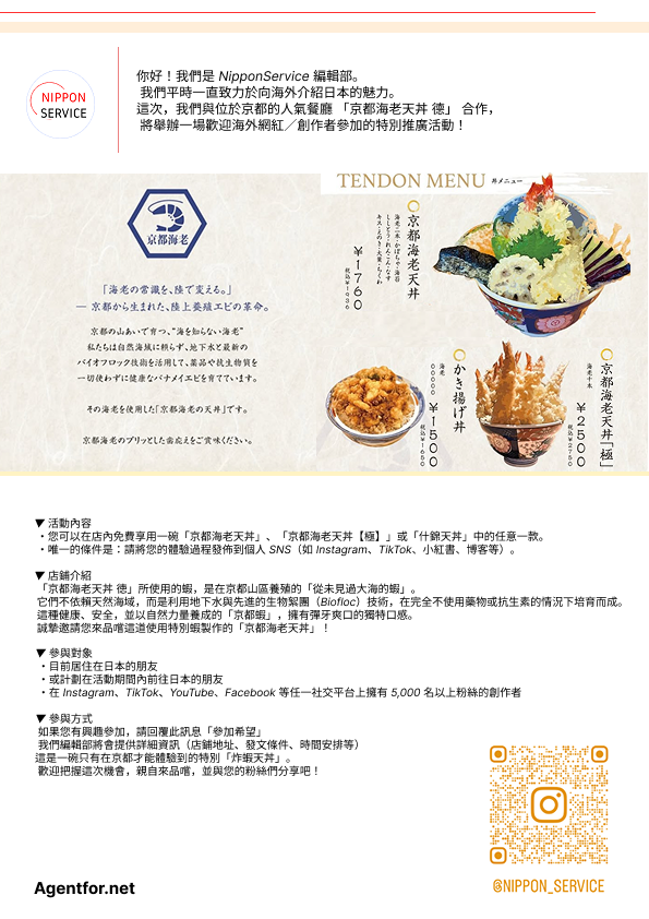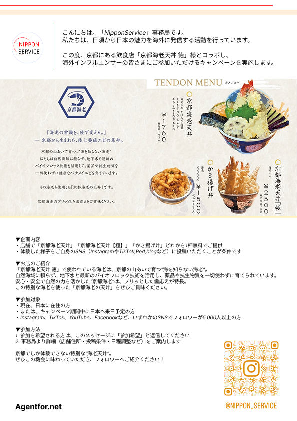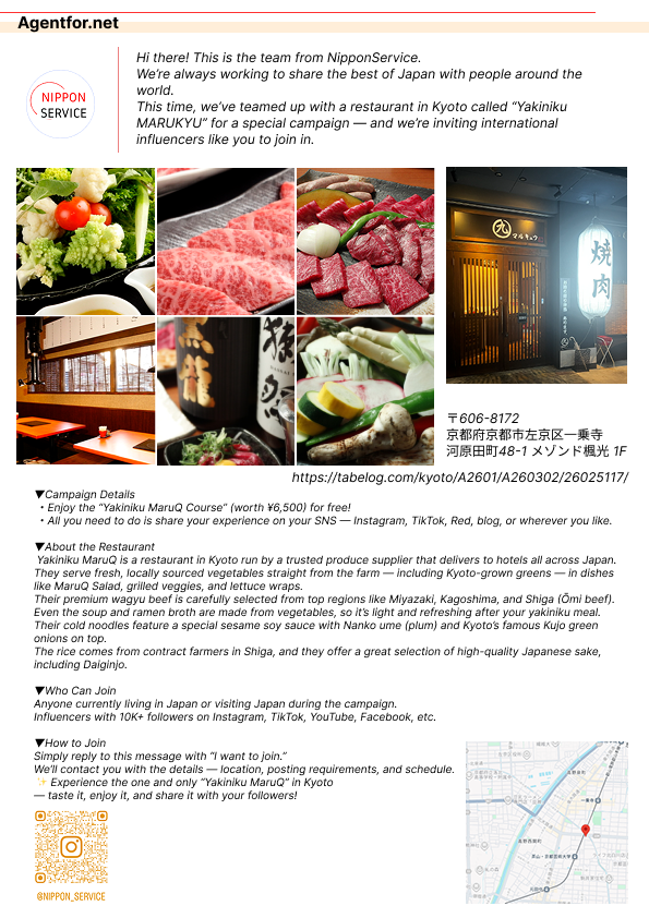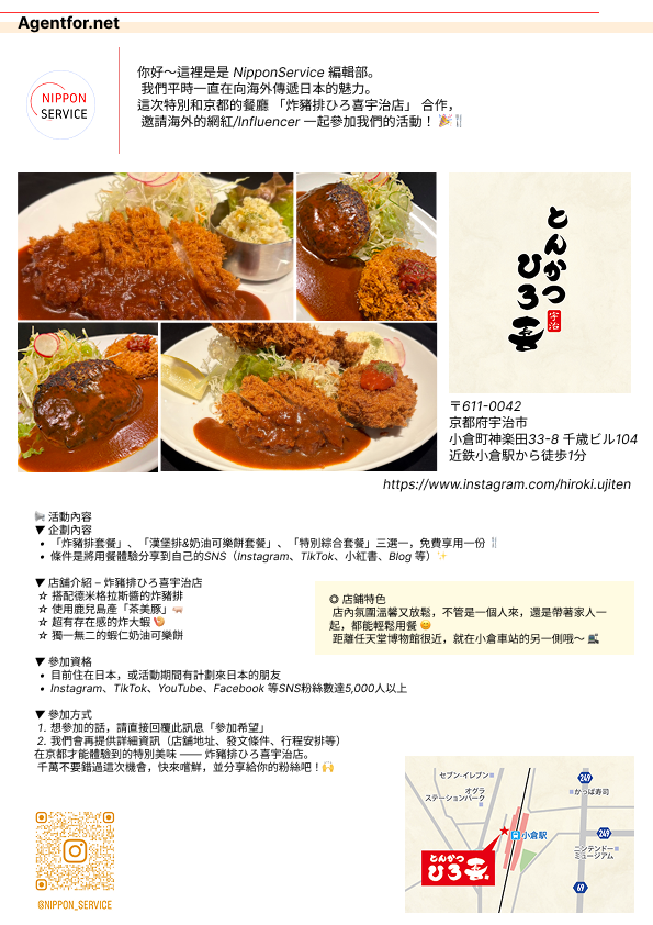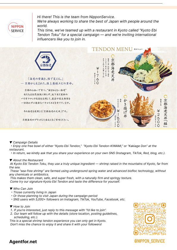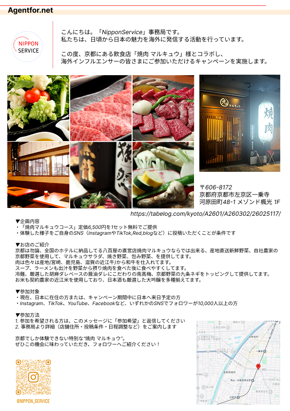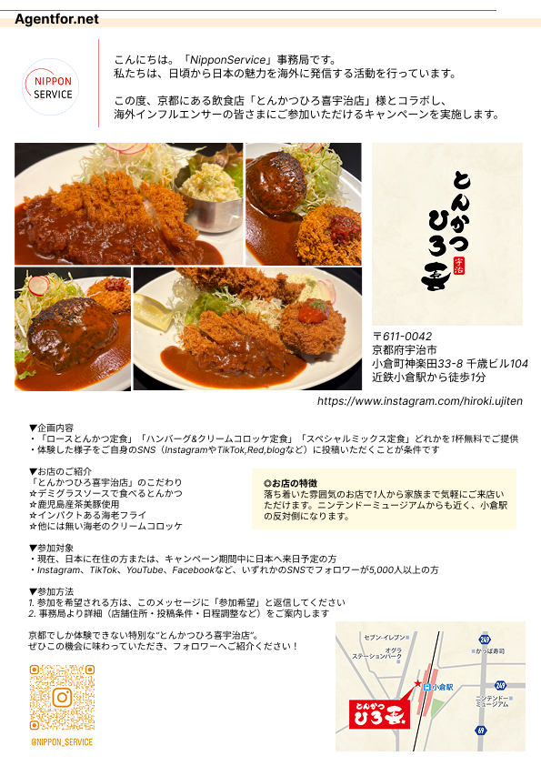 Case Special Information 「フォロワーの数だけ、チャンスがある。」あなたの影響力に合わせた新しいステージへ。NipponServiceでは、すべてのクリエイターが活躍できるチャンスを用意しています。 💎 Level 3:100,000 Followers ~ Premium Ambassadors🌸 Level 2:10,000 Followers ~ Growth Influencers🌿 Level 1:5000 Followers ~ Emerging Creators Case ☆ Invitation for creators with 100,000+ followers 「Invitation Only — 影響力のあるあなたにだけ届く特別な招待。」あなたの影響力で、日本の魅力を世界へ。こちらページは、ベテランのSNSインフルエンサー限定。日本企業や観光ブランドとのPR企画・体験型コラボなど、選ばれた方だけが参加できるプロジェクトをご案内しています。日本語 | English | 繁体字 | 簡体字 | 한국어💎 Level 3:100,000 Followers ~ Premium Ambassadors ☆ Invitation for creators with 10,000+ followers 「ブランドと共に成長するSNSクリエイターへ、あなたの発信が、ビジネスを動かす。フォロワー1万人からの本格コラボチャンス。」SNSで影響力を持ち始めたあなたへ。企業とのコラボ、レストラン・ホテルPR、製品紹介など、本格的なPR案件を通して“発信の力”を仕事に変えるチャンスです。🌸 Level 2:10,000 Followers ~ Growth Influencers 焼肉 マルキュウYAKINIKU Marukyu京都府京都市左京区一乗寺河原田町48-1 メゾンド楓光 1F 050-5589-9869営業時間:月・金・土・日17:30 – 23:00 (L.O. 22:00)火・水・木定休日日本語 | English | 繁体字 | 簡体字 | 한국어 English 繁体字 簡体字 한국어 ☆ Invitation for creators with 5,000+ followers 「あなたの“好き”を仕事に変える第一歩。フォロワー5,000人から始まる、新しいチャンス。あなたの投稿が、誰かの“発見”になる。」SNSで自分の世界を発信してきたあなたへ。まだ「お仕事としてのPR」は初めてでも大丈夫。NipponServiceでは、フォロワー5,000人以上のクリエイターを対象に、小規模案件・試作レビュー・体験モニターなど、実績作りをサポートします。“発信の力”を仕事に変えるチャンスです。🌿 Level 1:5000 Followers ~ Emerging Creators 京都海老天丼『徳』KyotoEBITENDON TOKU京都府京都市下京区真町81 2階 075-746-2983営業時間:11:30~15:00 17:00~22:00定休日:月曜日日本語 | English | 繁体字 | 簡体字 | 한국어 English 繁体字 簡体字 한국어 とんかつひろ喜TONKATSU HIROKI京都府宇治市小倉町神楽田33-8 千歳ビル104 近鉄小倉駅から徒歩1分075-746-2983営業時間:11:30〜LO14:30(ランチ)17:30〜LO21:00(ディナー)定休日:水曜日日本語 | English | 繁体字 | 簡体字 | 한국어 English 繁体字 簡体字 한국어 Custom Support 『Nippon Service』 詳細ページ日本の今を、世界へ日本の魅力を、ファッション、グルメ、テクノロジー、エンタメ——いま話題の情報を手軽にチェック!あなたの日常をもっと楽しく、もっと新しく。「日本を感じる、新しい日常。」>> NipponServiceサイト
