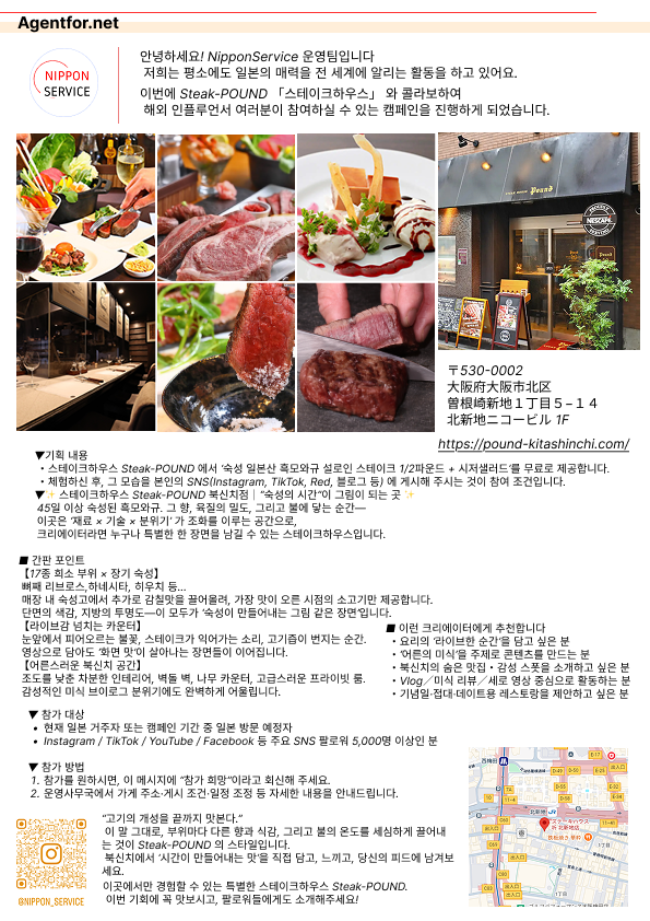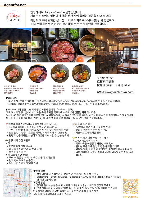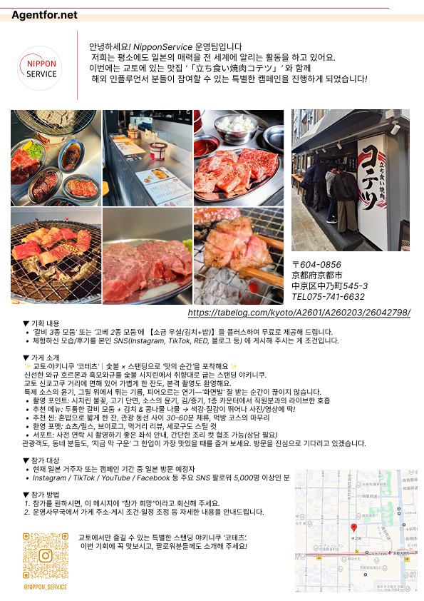 case Korea 한국어 인플루언서를 위한 프로젝트 소개 +이 설문조사는 당신에게 맞는 프로젝트만을 안내하기 위한 것입니다. 장르, 촬영 스타일, 활동 지역, 보수 조건 등을 사전에 공유해 주시면 앞으로 조건에 맞지 않는 의뢰나 무리한 요청을 줄이고, 당신의 강점과 세계관에 어울리는 프로젝트만을 전달해 드릴 수 있습니다. Special Information 「팔로워 수만큼, 기회가 있습니다。」당신의 영향력에 맞춘 새로운 무대로.NipponService는 모든 크리에이터가 활약할 수 있는 기회를 제공합니다. 💎 Level 3:100,000 Followers ~ Premium Ambassadors🌸 Level 2:10,000 Followers ~ Growth Influencers🌿 Level 1:5000 Followers ~ Emerging Creators Case ☆ Invitation for creators with 100,000+ followers 「Invitation Only — 영향력 있는 당신에게만 전해지는 특별한 초대。」당신의 영향력으로 일본의 매력을 세계로.이 페이지는 베테랑 SNS 인플루언서 전용입니다.일본 기업 및 관광 브랜드와의 PR 기획, 체험형 콜라보 등선별된 분들만 참여할 수 있는 프로젝트를 안내합니다.日本語 | English | 繁体字 | 簡体字 | 한국어💎 Level 3:100,000 Followers ~ Premium Ambassadors ☆ Invitation for creators with 10,000+ followers 브랜드와 함께 성장하는 SNS 크리에이터에게, 당신의 발신이 비즈니스를 움직입니다. 팔로워 1만 명부터 시작되는 본격적인 콜라보 기회. SNS에서 영향력을 갖기 시작한 당신에게. 기업과의 콜라보, 레스토랑·호텔 PR, 제품 소개 등 본격적인 PR 프로젝트를 통해 ‘발신의 힘’을 일로 바꿀 기회입니다. 🌸 Level 2:10,000 Followers ~ Growth Influencers 和牛一族Wagyu ICHIZOKU〒612-0012 京都府京都市伏見区 深草一ノ坪町36-6 080-7657-8391営業時間:昼:11:30~15:30、夜:17:00~21:00定休日:月曜日URL:https://wagyuichizoku.com/ ステーキハウス 听 北新地店Steak House Pond大阪府大阪市北区曽根崎新地1丁目5−14北新地ニコービル 1F営業時間:11:30〜14:00/17:30〜23:00定休日:不定休(1月1~3日のみ休み)URL: https://pound-kitashinchi.com/ 立ち食い焼肉コテツYakiniku Kotetsu京都府京都市中京区中乃町545-3TEL: 075-741-6632営業時間:11:00 – 20:00https://www.instagram.com/tatiguiyakinikukotetsu/ 焼肉 マルキュウYAKINIKU Marukyu京都府京都市左京区一乗寺河原田町48-1 メゾンド楓光 1F 050-5589-9869営業時間:月・金・土・日17:30 – 23:00 (L.O. 22:00)定休日:火・水・木 ☆ Invitation for creators with 5,000+ followers 당신의 ‘좋아함’을 일로 바꾸는 첫걸음.팔로워 5,000명부터 시작되는 새로운 기회.당신의 게시물이 누군가의 ‘발견’이 됩니다.SNS에서 자신의 세계를 발신해 온 당신에게.아직 ‘업무로서의 PR’가 처음이어도 괜찮습니다.NipponService에서는 팔로워 5,000명 이상의 크리에이터를 대상으로소규모 프로젝트, 시제품 리뷰, 체험 모니터 등실적을 쌓을 수 있도록 지원합니다.‘발신의 힘’을 일로 바꿀 수 있는 기회입니다.🌿 Level 1:5000 Followers ~ Emerging Creators 京都海老天丼『徳』KyotoEBITENDON TOKU京都府京都市下京区真町81 2階 075-746-2983営業時間:11:30~15:00 17:00~22:00定休日:月曜日 とんかつひろ喜TONKATSU HIROKI京都府宇治市小倉町神楽田33-8 千歳ビル104 近鉄小倉駅から徒歩1分075-746-2983営業時間:11:30〜LO14:30(ランチ)17:30〜LO21:00(ディナー)定休日:水曜日 Google 설문 양식에 상세하게 입력하는 것은고품질 프로젝트를 확보하기 위한 ‘첫 번째 단계’입니다.영향력과 전문 분야를 정확히 파악함으로써,당신에게 가장 적합한 프로젝트 정보를 가장 빠르게 전달해 드립니다. Custom Support 『Nippon Service』 상세 페이지일본의 지금을, 세계로.일본의 매력을 패션, 미식, 테크놀로지, 엔터테인먼트——지금 화제가 되는 정보를 간편하게 확인하세요.당신의 일상을 더 즐겁게, 더 새롭게.“일본을 느끼는, 새로운 일상.”>> NipponService 사이트